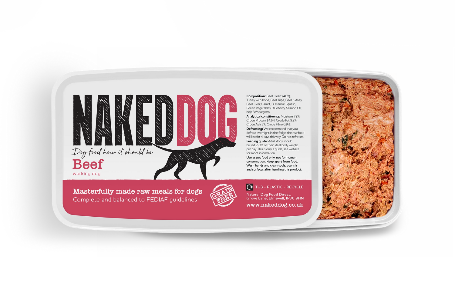 Our range is aimed to be a medium ground mince. Neither fine nor what is described as chunky. You can see many images, including videos, of open Naked Dog tubs of food on our social media channels.