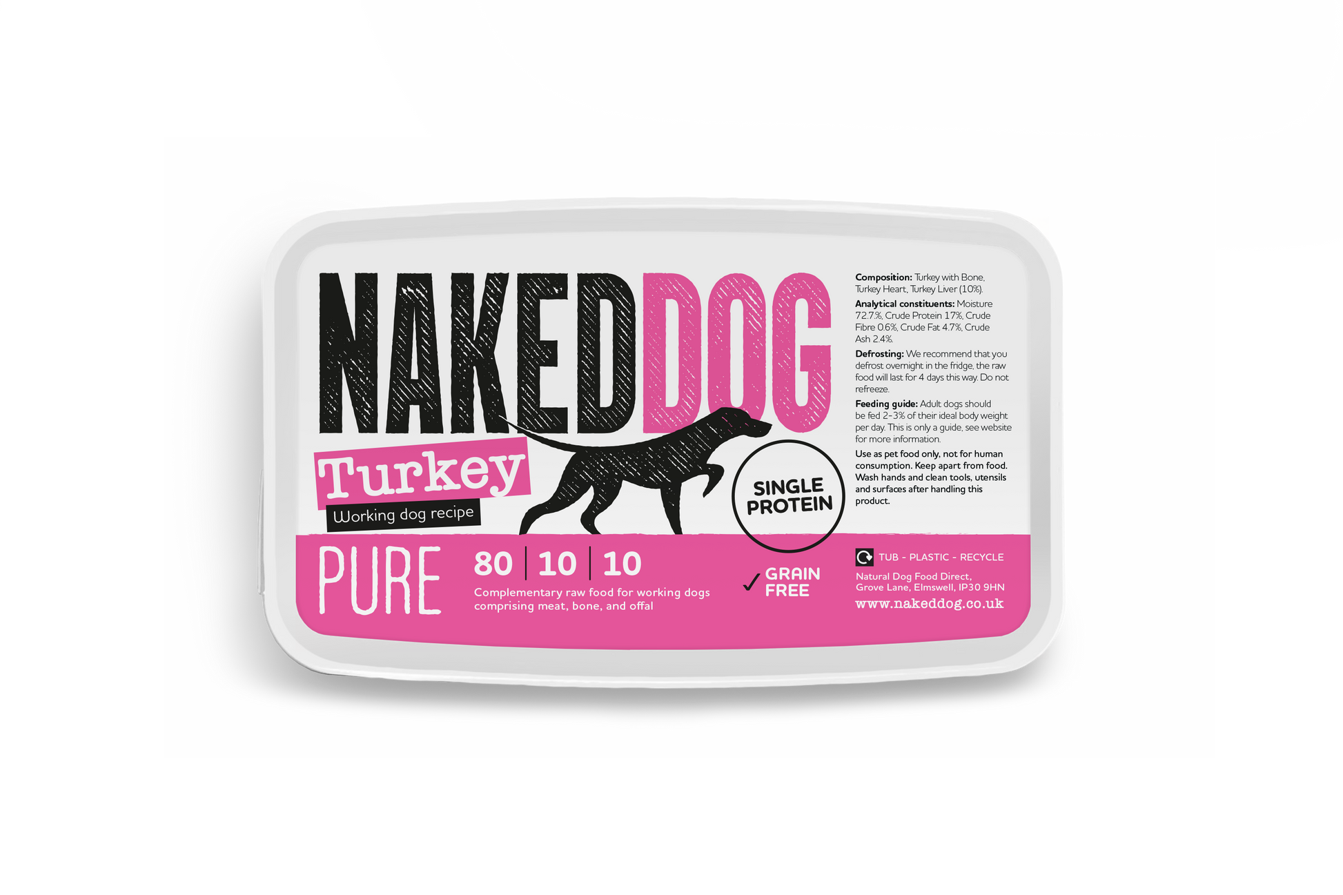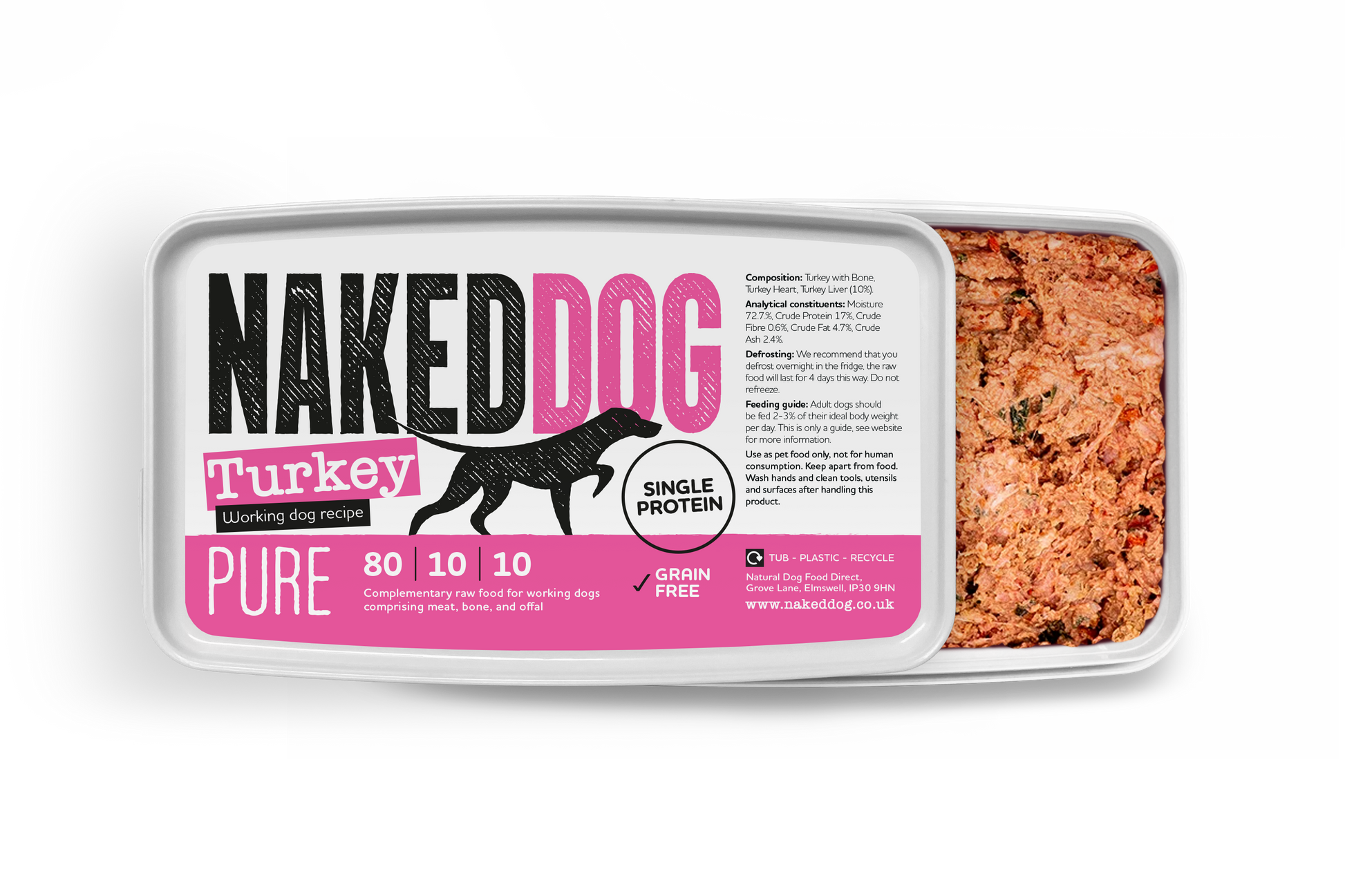 User friendly recyclable tub takes the fuss and mess out of raw feeding - and can be easily stored in the fridge for up to 4 days!